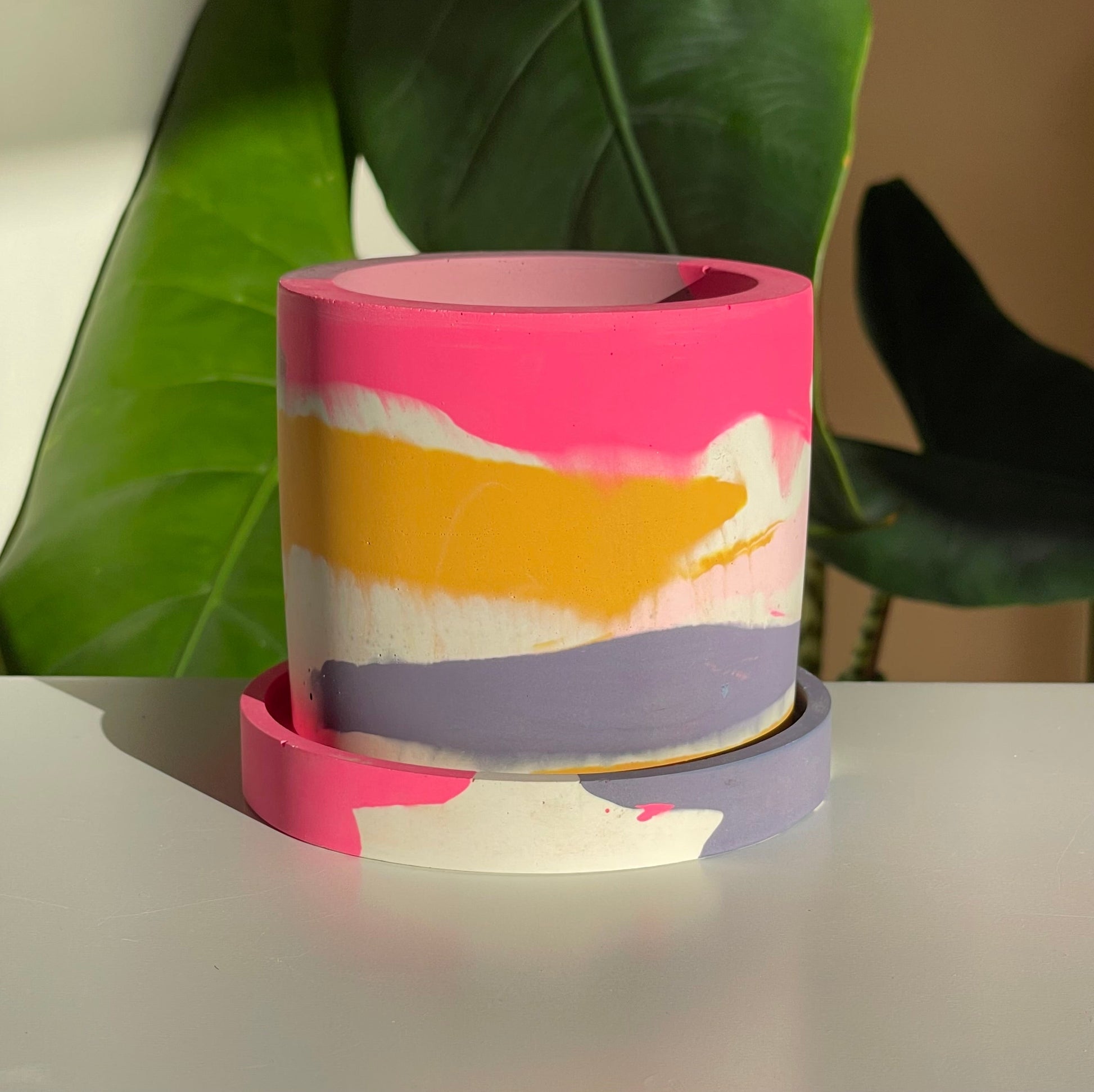 The refillable Groves pot with matching coaster. Blending shades of pink and purple with bursts of yellow and warm pools of orange. Please note that candle refills are not included. Due to the handmade nature of our pots slight colour discrepancies may occur.